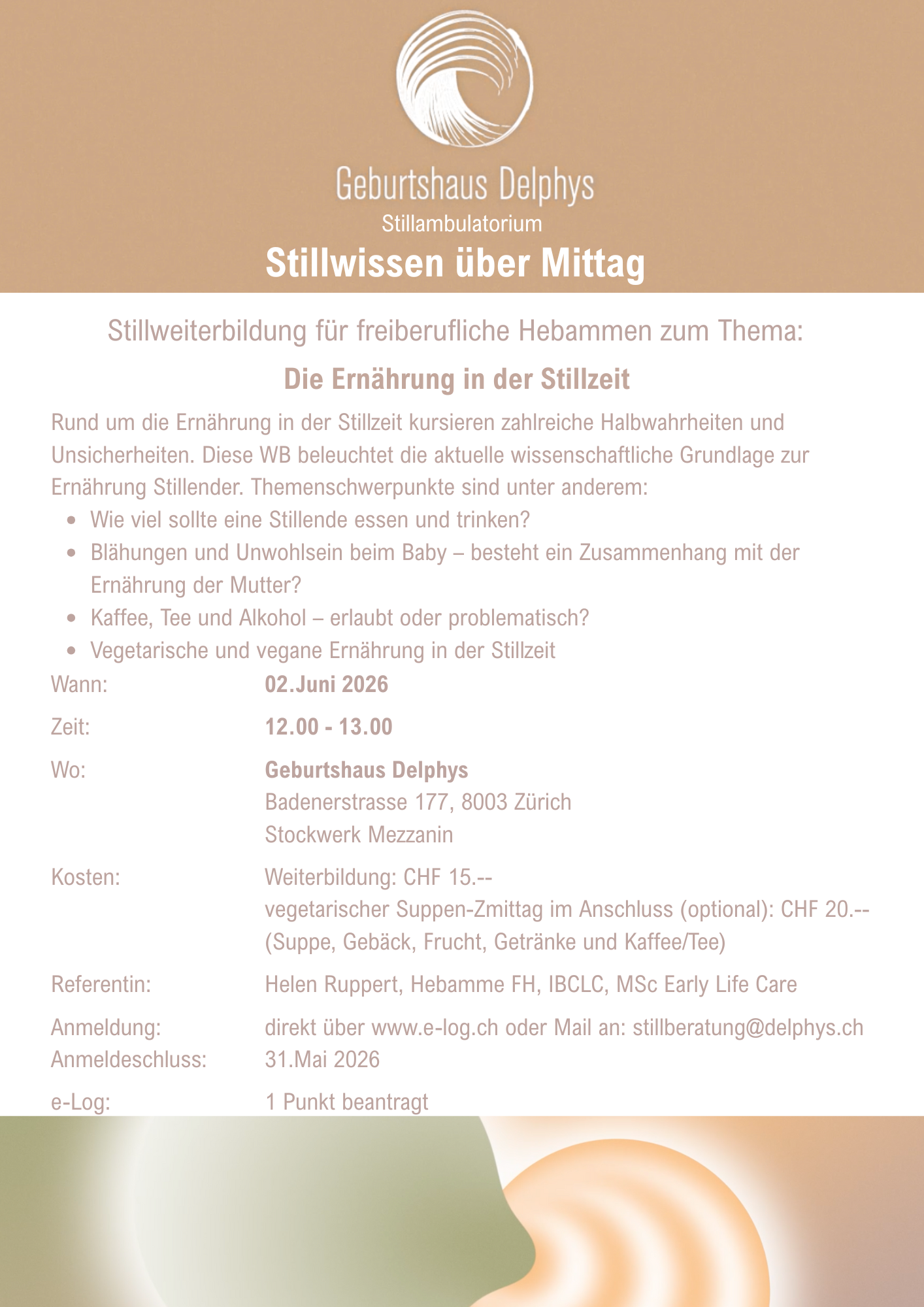 Rund um die Ernährung in der Stillzeit kursieren zahlreiche Mythen, Halbwahrheiten und Unsicherheiten. Diese Weiterbildung beleuchtet die aktuelle wissenschaftliche Grundlage zur Ernährung Stillender und befähigt die Teilnehmenden, Fragen kompetent und sicher zu beantworten.